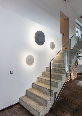 Durch die runde Form sorgt die jeweilige Leuchte für eine gleichmäßige Lichtverteilung und weiche Lichtverläufe. Letztere fördern wiederum eine behagliche Atmosphäre, sodass selbst beim Treppensteigen so etwas wie Entspannung aufkommen kann.