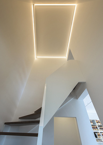 Die Voutenbeleuchtung lenkt das Licht zum einen nach oben an die Decke und zum anderen nach unten an die angrenzenden Wände. So entsteht eine sanfte Beleuchtung, die den Treppenaufgang in ungewöhnlicher Weise erhellt.