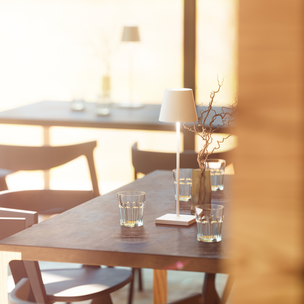 Innen & Außen: Die dimmbare Akku-Tischleuchte für den Wohn- und Außenbereich hält dank Schutzart IP54 (spritzwassergeschützt) auch Regenschauer aus.