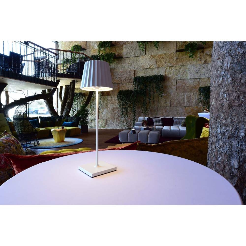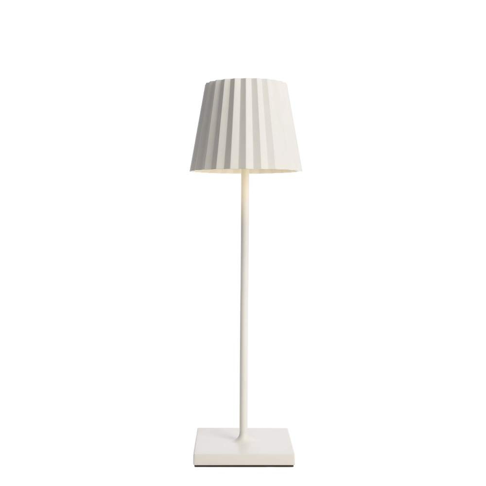 Die SHERATAN ist eine akkubetriebene LED-Tischleuchte, die sich über einen integrierten USB-Anschluss aufladen lässt. Damit eignet sich die SHERATAN nicht nur für den Einsatz als Akzentlicht in Wohnräumen, sondern auch auf Events, wie Gala- und Firmenveranstaltungen sowie Gartenparties. Das 38 cm hohe Gehäuse mit gewelltem oder glattem Lampenschirm und standfester Bodenplatte aus robustem Aluminium Druckguss [IP54] beherbergt ein LED-Leuchtmittel mit 2,2 Watt, das ein angenehmes warmweißes Licht mit 3000 K erzeugt und sich über einen Touch-Sensor stufenlos dimmen sowie ein- und ausschalten lässt.