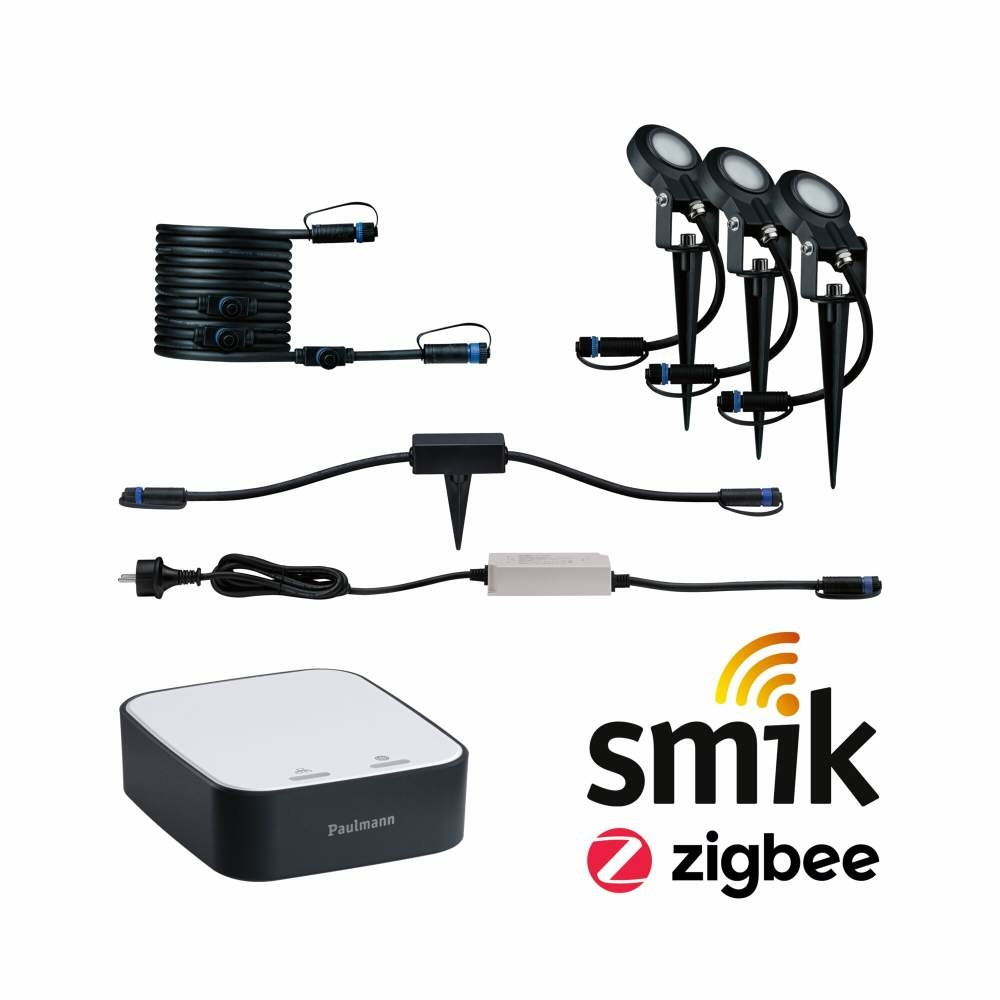 Dieses smarte Bundle bringt die Außenbeleuchtung auf ein neues Level. Das Plug & Shine Sting Starterset bestehend aus drei warmweißen Erdspießen, Trafo und Verbindungskabel bietet einen idealen Einstieg in die Außenbeleuchtung. Die Spieße eignen sich ideal zum Anstrahlen von Pflanzen oder Gegenständen, sie lassen sich individuell ausrichten und sind absolut wetterbeständig. Mit dem Plug & Shine Zigbee-Controller können die Erdspieße geschaltet und gedimmt werden. Der Einzelcontroller ist die perfekte Ergänzung für ein System, welches mit unterschiedlichen Szenarien im Garten oder auf der Terrasse gesteuert werden soll. Der Controller ist Zigbee 3.0 kompatibel. Dank des Paulmann smik Gateways kann eine individuelle Konfiguration vorgenommen werden. Mit der dazugehörigen Paulmann smik App lassen sich Gruppentasten belegen. Das Gateway ist handlich kompakt. Das Licht lässt sich von zu Hause oder unterwegs per App, Sprache oder Schalter steuern. Bei Bedarf kann das System um weitere Plug & Shine Komponenten erweitern werden.