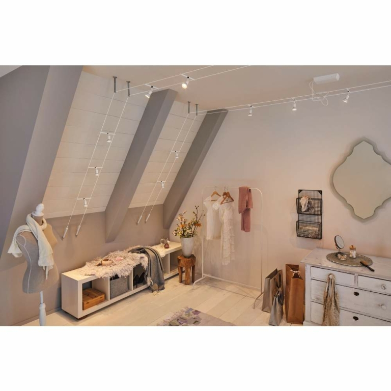 Das Basic Set in Weiß matt kann sowohl an der Wand als auch an der Decke montiert werden und bietet dadurch grenzenlose Gestaltungsmöglichkeiten. Egal ob gerade, schräg oder verwinkelt - Seilsysteme passen in jeden Raum und sind die Problemlöser für schwierige Installationsbedingungen. Das Basisset lässt sich individuell durch Einzelspots, Umlenker und weiteres Zubehör ergänzen. Das Seil mit einer Länge vom 10 m, kann in der Mitte geteilt werden, sodass das System auf max. 5 m gespannt werden kann. Mit diesem System lässt sich eine optimale Lichtverteilung realisieren, bei steigendem Lichtbedarf lässt es sich problemlos erweitern. Für die Verteilung der Leuchten im gesamten Raum wird nur ein Stromauslass benötigt. Systeme mit der Technik 12V DC (Gleichspannung) lassen sich nicht über einen Wand-Einbaudimmer dimmen.