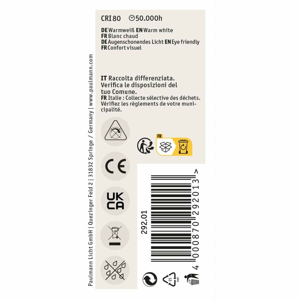 Die ultra-effizienten Leuchtmittel der Eco-Line verbinden Innovation mit Nachhaltigkeit. Durch den 60 % niedrigeren Energieverbrauch und die deutlich längere Lebensdauer gegenüber Standard LED-Lampen lassen sich die Energiekosten deutlich senken und ganz nebenbei noch die Umwelt schonen. Das kerzenförmige Leuchtmittel mit , einer Leistung von 4W und 840lm schafft ein angenehm gleichmäßiges Licht ohne Grünstich. Kerzenlampen eignen sich durch ihre schmale Bauform besonders für den Einsatz in Lüstern, Wand- und Deckenleuchten und sorgen mit ihrem angenehmen Licht für eine Wohlfühlatmosphäre in den eigenen vier Wänden. Die Lampe passt in jede handelsübliche E14 Fassung. Die Paulmann LED-Lampen mit Eye friendly-Siegel bieten augenschonendes und komfortables Licht. Ob beim Arbeiten, Lesen oder Entspannen, die Lampen tragen zu bestem Sehkomfort bei.