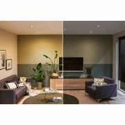 Die dekorativen Einbauleuchten Gil im 3er-Set in der Farbe Weiß matt#Eisen gebürstet sorgen mit ihrem zweifarbigem Design für Lichthighlights und setzen blendfreie Akzente an der Decke. Durch den hervorstehenden Dekozylinder wird eine geringere Einbautiefe im Vergleich zu den zurückgesetzten Lichtpunkten benötigt. Hat man sie entdeckt, möchte man gar nicht mehr wegschauen. Die Strahler punkten mit brillanter Technik: Die wechselbaren LED Coins liefern angenehm warmweißes Licht, lassen sich mit einem herkömmlichen Lichtschalter in drei Stufen dimmen und sind untereinander unendlich verkettbar. Sie benötigen einen Bohrdurchmesser von 62 mm.