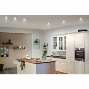 Die dekorative Einbauleuchte Gil in der Farbe Weiß matt#Gold sorgt mit ihrem zweifarbigem Design für Lichthighlights und setzt blendfreie Akzente an der Decke. Durch den hervorstehenden Dekozylinder wird eine geringere Einbautiefe im Vergleich zu den zurückgesetzten Lichtpunkten benötigt. Hat man sie entdeckt, möchte man gar nicht mehr wegschauen. Die Strahler punkten mit brillanter Technik: Die wechselbaren LED Coins liefern angenehm warmweißes Licht, lassen sich mit einem herkömmlichen Lichtschalter in drei Stufen dimmen und sind untereinander unendlich verkettbar. Sie benötigen einen Bohrdurchmesser von 62 mm.