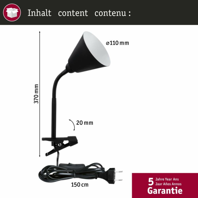 Paulmann 95430 Klemmleuchte Vitis Flexarm Schnurschalter Schwarz 230V E14