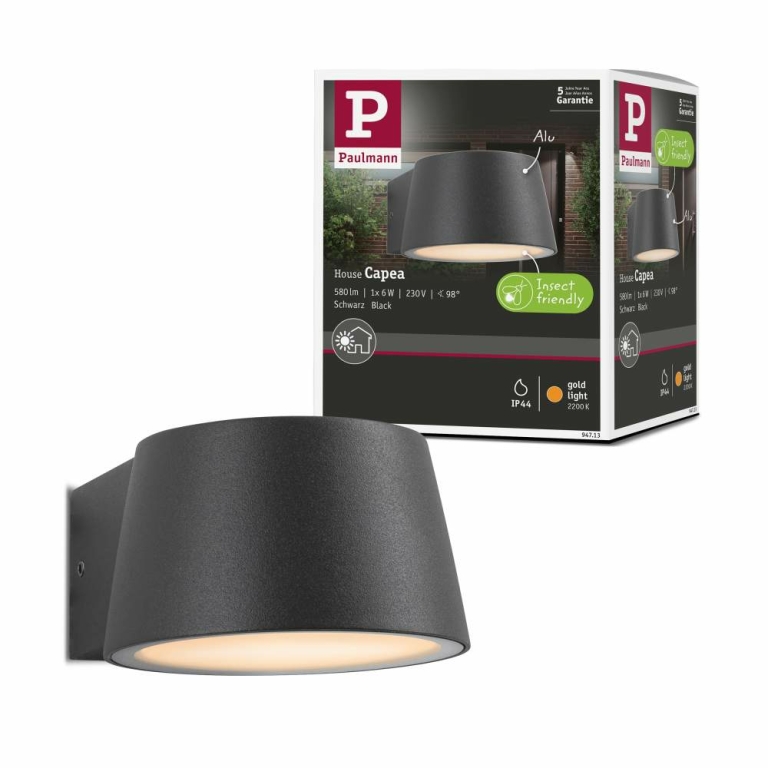 Die Außenwandleuchte Capea mit einer Leistung von 6W setzt attraktive Lichteffekte und erhöht die Sicherheit durch Beleuchtung im Außenbereich. Sie bringt Licht an die Außenwände und leuchtet den Eingangsbereich gleichmäßig aus. Mit einer Lichtfarbe von 2.200 K ist die Wandleuchte besonders insektenfreundlich, dieser Wert liegt außerhalb des sichtbaren Bereiches für die meisten Insekten, somit werden diese nicht von der zusätzlichen Lichtquelle angezogen. Die Leuchte schützt die Insekten aktiv, ohne dabei den Nutzen für den Menschen zu vernachlässigen. Das warme Goldlicht schafft eine angenehme Stimmung rund ums Haus.