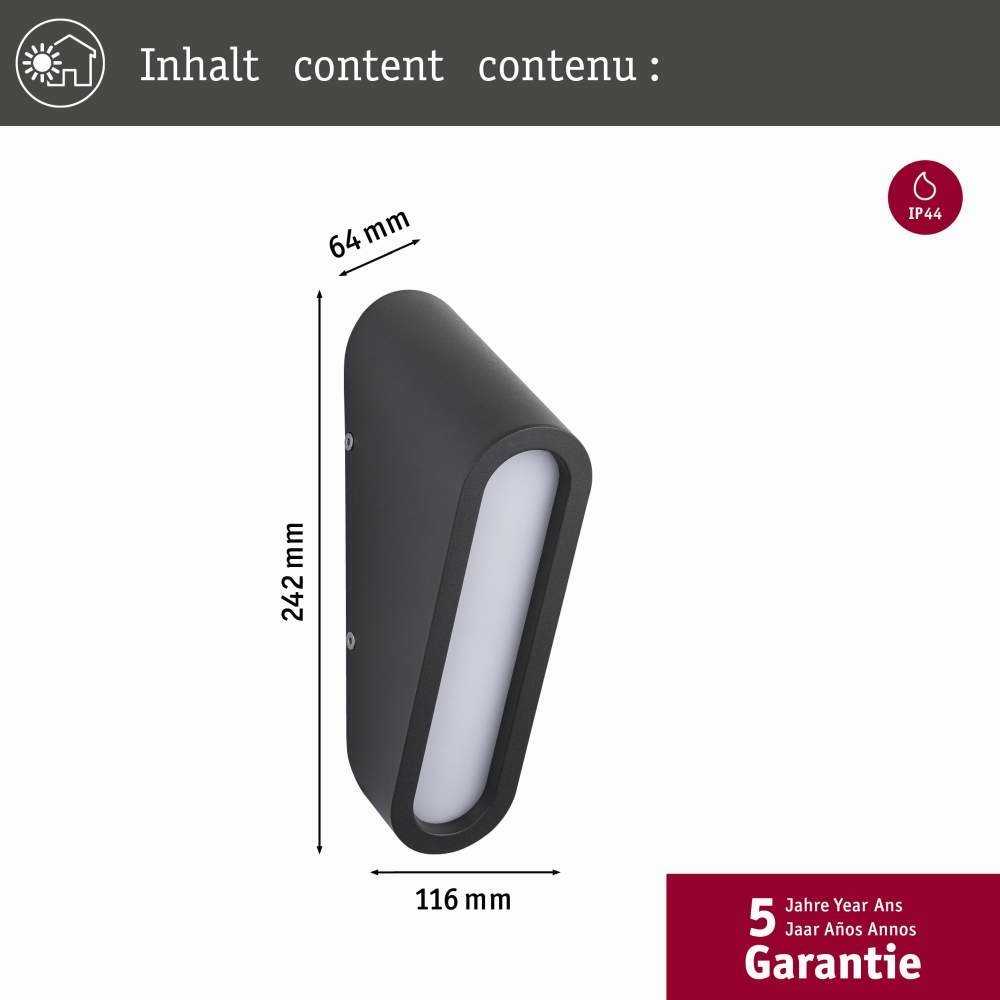 Paulmann 94733 LED Außenwandleuchte Cliff seewasserresistent IP44 64x116mm 3000K 9,5W 300lm 230V Anthrazit Aluminium
