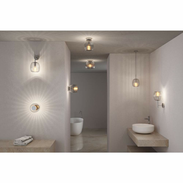 Die Wand-/Deckenleuchte Ruya in Glas#Chrom vereint hochwertige Beleuchtung und stilvolles Design. Die perfekte Kombination aus Funktionalität und Lichtstreuung setzt gezielte Akzente und erzeugt beeindruckende Lichteffekte im Raum. Die Struktur und Oberfläche des Glaskörpers sorgen für großartige Lichteffekte im Raum. Dank ihrer IP44-Schutzklasse ist sie ideal für Feuchträume geeignet. Die Leuchte hat einen Durchmesser von 25 cm und kann mit einem E27-Leuchtmittel bestückt werden. Die Serie Ruya bietet verschiedene Leuchtentypen für Wand, Decke, Spiegel oder als Pendel an, die sich perfekt ergänzen und eine abgestimmte Gesamtkomposition unterschiedlicher Lichtquellen erzeugen. Mit Ruya lassen sich im perfekten Zusammenspiel von Licht und Design die richtigen Beleuchtungsakzente im privaten oder gewerblichen Bereich setzen.