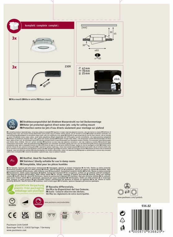 Paulmann 93682 LED Einbauleuchten 3er Set Nova Plus Coin rund 6W 470lm IP65 Weiß matt schwenkbar dimmbar 230V