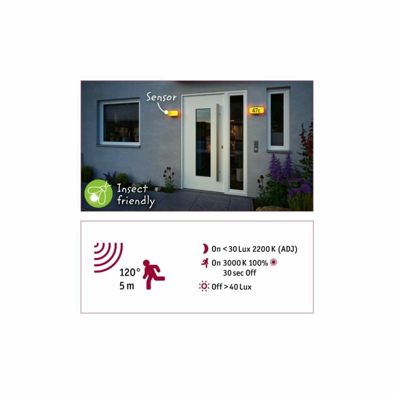 Elegante, randlose und mit modernsten Steuerungsmöglichkeiten, diese smarte Außenwandleuchte Sheera kann mit einer Hausnummer ergänzt werden und bringt Licht an die Außenwand. Sie trägt zur besseren Orientierung in der Dunkelheit bei und sorgt für mehr Sicherheit. Die Tunable-Warm-Funktion bietet freie Wahl bei der Farbtemperatur im Warmlichtbereich. Über die Zigbee-Funktion können die Helligkeit und die Farbtemperatur zwischen 2.200 Kelvin und 3.000 Kelvin eingestellt werden. Bei Dunkelheit schaltet sich die Leuchte mit der ausgewählten Helligkeit und Lichtfarbe ein. Sobald sich jemand annähert, wird das Außenlicht durch den verbauten Bewegungsmelder auf 100 % Helligkeit und 3.000 Kelvin geschaltet und nach etwa 30 Sekunden wieder zurück auf den vorher eingestellten Wert. 2.200 Kelvin liegen außerhalb des sichtbaren Bereiches für die meisten Insekten, somit werden diese nicht von der zusätzlichen Lichtquelle angezogen und die Leuchte ist damit besonders insektenfreundlich. Zigbee ist ein Funkübertragungsprotokoll, das Geräte verschiedener Hersteller miteinander vernetzt. Nutzbar mit Smart Home Gateways, die über eine Zigbee Schnittstelle verfügen.