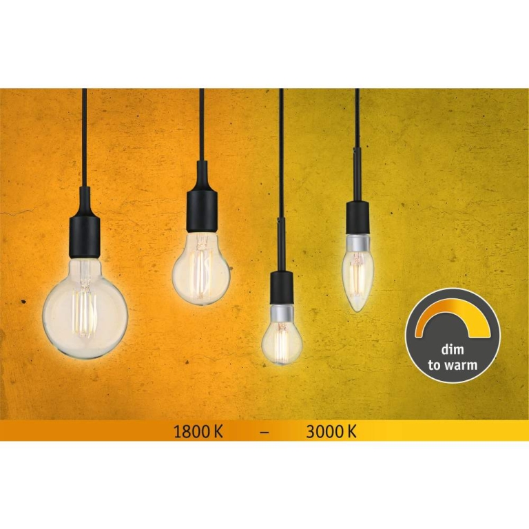 Die Filament-Tropfenlampe mit einer Leistung von 5 Watt gibt ihr warmweißes Licht in alle Richtungen ab. Mit einem handelsüblichen Wand-Dimmer kann die Lichtfarbe zwischen 1.800 und 3.000 Kelvin eingestellt werden. Dadurch kann, je nach Stimmung, zwischen gemütlichem Goldlicht und angenehm tageslichtweißem Licht gewechselt werden.