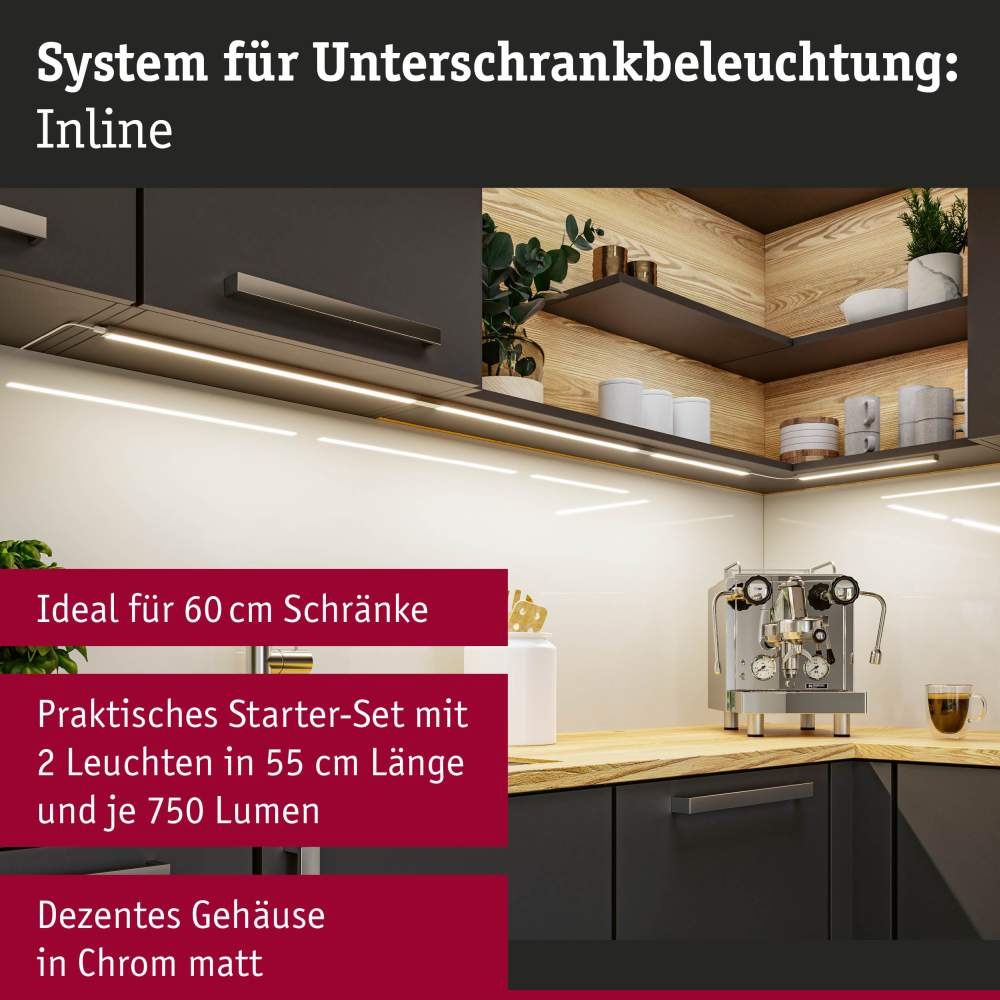 Paulmann 98617 LED Unterschrankleuchte Inline 2er-Set Starterset PIR-Sensor Tunable White 2x6W 550x26mm 2x500lm 24V Chrom matt mit Steckertrafo
