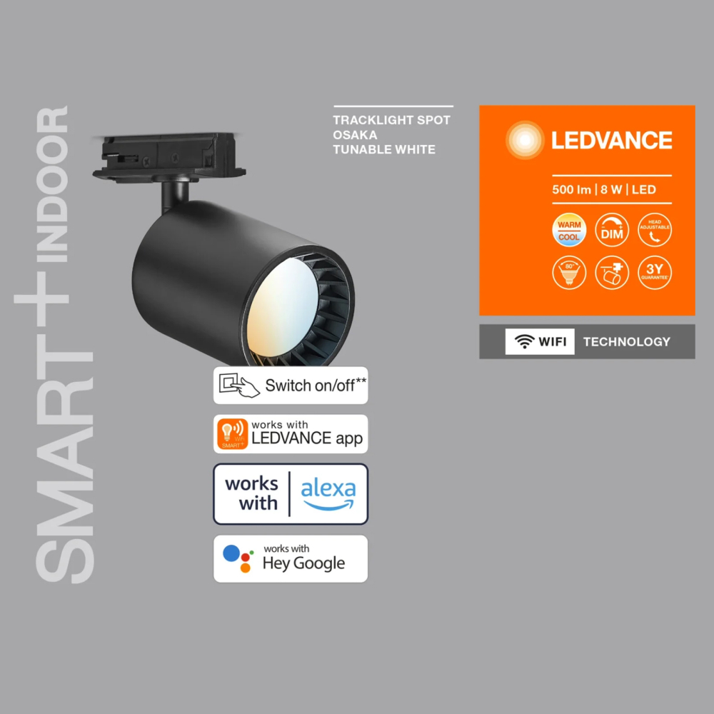 LEDVANCE SMART+ TRACKLIGHT OSAKA schwarz, 8W, 500lm, ausrichtbarer Leuchtenkopf, regulierbares Weißlicht (3000K-6500K), steuerbar per App, kompatibel mit Amazon, Google etc.