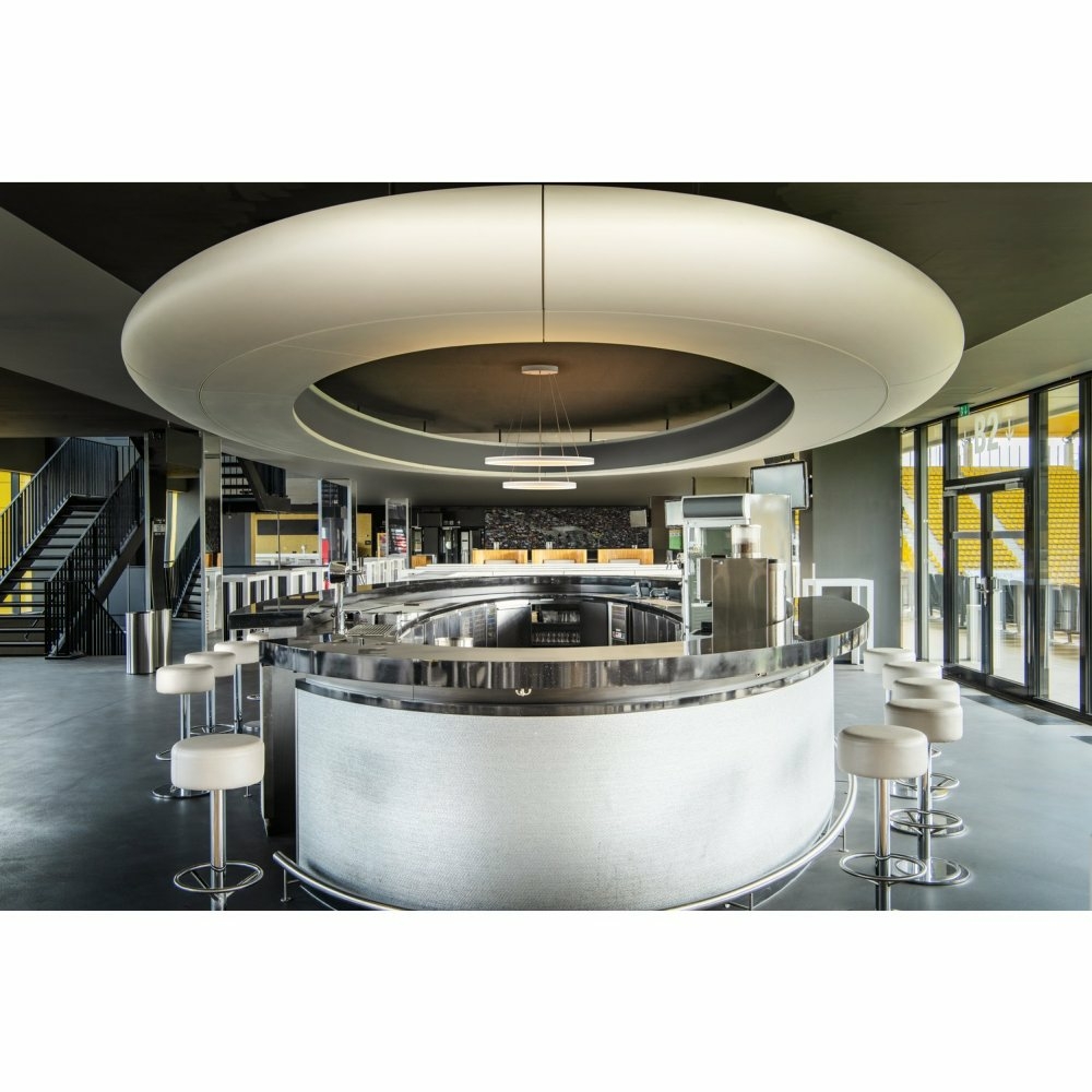 Runde Sache für repräsentative Räume: Reduziert und modern zieht die neue Pendelleuchte der ONE Familie alle Blicke auf sich. Und das gleich im doppelten Sinn als Double Version. Die Ringe können durch gleiche Kabellängen pro Ring klassisch installiert werden, so dass die Ringe übereinander hängen. Alternativ können pro Ring unterschiedliche Kabellängen gewählt werden, so dass die Ringe elliptisch gekreuzt wirken. Dabei ist sie wartungsarm und mit einer zu erwartenden Lebensdauer von bis zu 30.000 Stunden nicht für die Hotellerie und Gastronomie, sondern auch für stillvoll eingerichtete Wohnräume wie gemacht. Die Lichtstimmung (2700/3000K) lässt sich via CCT-Schalter vor der Installation beeinflussen. CRI>90 sorgt für eine hohe Qualität des ringförmig nach oben wie unten abstrahlenden und DALI dimmbaren Lichts.