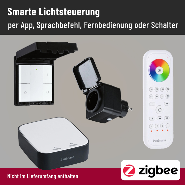 - Steuerung per Fernbedienung / Schalter (ohne Gateway): Paulmann Gent 2 ZigBee Fernbedienung, ZigBee Outdoor Smart-Switch Wandschalter