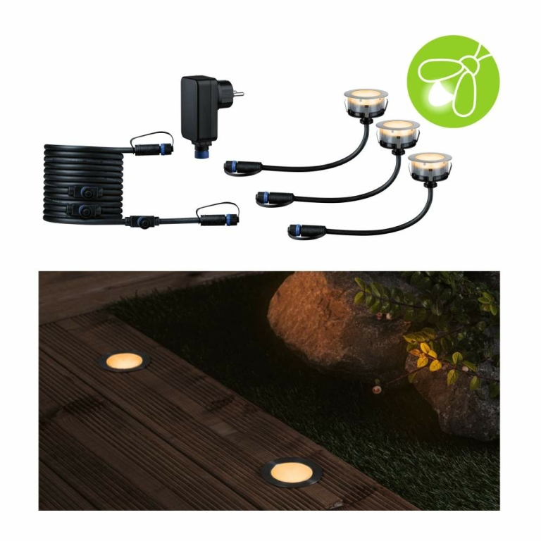 Die Plug & Shine Floor Bodeneinbaustrahler ${Abmessungen_Naming} sorgen für dekorative warmweiße Lichtpunkte an Weg- oder Terrassenbegrenzungen. Die Strahler mit einer Lichtfarbe von 2.200 K sind besonders insektenfreundlich, denn dieser Wert liegt außerhalb des sichtbaren Bereiches für Insekten, somit werden diese nicht von der zusätzlichen Lichtquelle angezogen. Die Leuchten schützen die Insekten aktiv, ohne dabei den Nutzen für den Menschen zu vernachlässigen. Das warme Goldlicht schafft eine angenehme Stimmung rund ums Haus. Dieses Starterset enthält drei Leuchten, einen Steckertrafo und ein Verbindungskabel mit drei Anschlussbuchsen. Nicht benötigte Abgänge lassen sich mit den mitgelieferten Abdeckkappen verschließen. Nur so lässt sich der IP68-Tauchwasserschutz des Verbinders gewährleisten. Bei Bedarf lässt sich das System um weitere Plug & Shine Komponenten erweitern. Es ist nicht begeh- oder befahrbar.