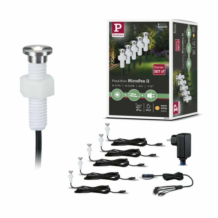 - Plug & Shine Basisset bestehend aus 5 Leuchten, Verbindungskabel und Trafo