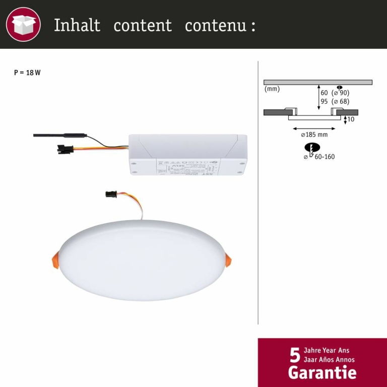 Flexibel einsetzbar wie noch nie! Das Einbaupanel Veluna VariFit mit dem Durchmesser von 185 mm besticht durch eine absolut randlose und homogene Lichtfläche. Mit einer superschlanken Aufbauhöhe von nur 10 mm verschmelzt das Panel quasi mit der Decke oder der Wand. Durch den Spritzwasserschutz ist es für den Einsatz im Badezimmer oder Feuchtraum geeignet. Die satinierte Oberfläche der Diffusorplatte sorgt für angenehm flächiges Raumlicht. Die Klemmfedern für den Einbau sind stufenlos auf jede übliche Einbaulochgröße zwischen 60 und 160 mm einstellbar, das erleichtert den Austausch alten Systeme enorm. Mit der Tunable White Weißlichtsteuerung lässt sich die Lichtfarbe der Leuchte individuell und stufenlos einstellen - von tageslichtweißem Arbeitslicht bis hin zu warmweißer Entspannungsbeleuchtung ist alles möglich. Die Leuchte ist Zigbee 3.0 kompatibel. Zigbee ist ein Funkübertragungsprotokoll, das Geräte verschiedener Hersteller miteinander vernetzt.