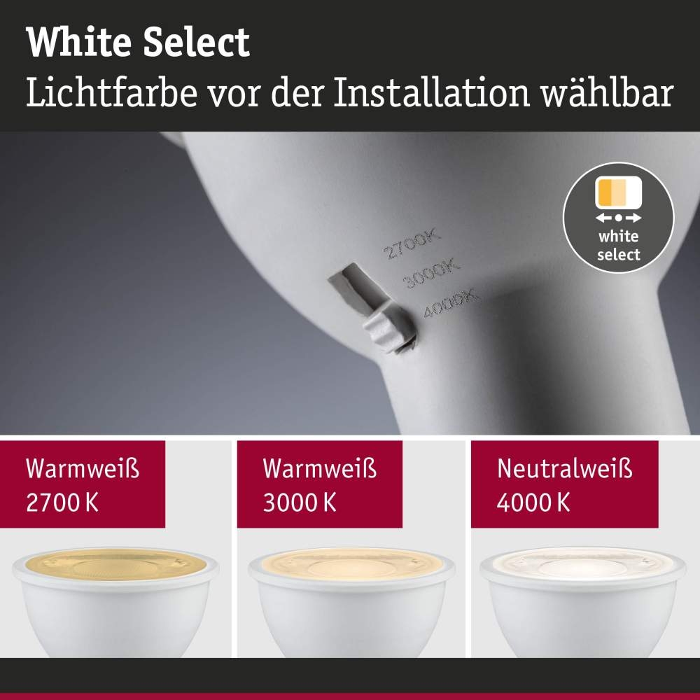 Mit diesem signalweißen GU10 Leuchtmittel gelingt die Wahl der passenden Lichtfarbe immer. Per Dip-Schalter lässt sich die Farbtemperatur flexibel zwischen zwei wohnlichen Warmweiß-Tönen (2700K und 3000K) und einem funktionalen Neutralweiß (4000K) wechseln – optimal für vielfältige Einsatzbereiche von Wohnraum bis Arbeitsplatz. Die Einstellung der Lichtfarbe kann sowohl beim Einbau als auch nachträglich vorgenommen werden. Nach Bedarf kann die Helligkeit stufenlos gedimmt werden. Mit einer Leistung von 6,9W und 650lm sowie einem Ausstrahlwinkel von 50° eignet sich die Lampe sowohl für die gezielte Ausleuchtung von Arbeits- oder Lesebereichen als auch für die Grundbeleuchtung in Büros oder Wohnbereichen. Das Leuchtmittel passt in alle GU10 Fassungen und kann in Einbauspots, Spots und verschiedensten Leuchten eingesetzt werden. Die Lebensdauer von 25.000 Stunden sorgt dabei für eine dauerhaft zuverlässige Beleuchtung. Die Paulmann LED-Lampen mit Eye friendly-Siegel bieten augenschonendes und komfortables Licht. Ob beim Arbeiten, Lesen oder Entspannen, die Lampen tragen zu bestem Sehkomfort bei.