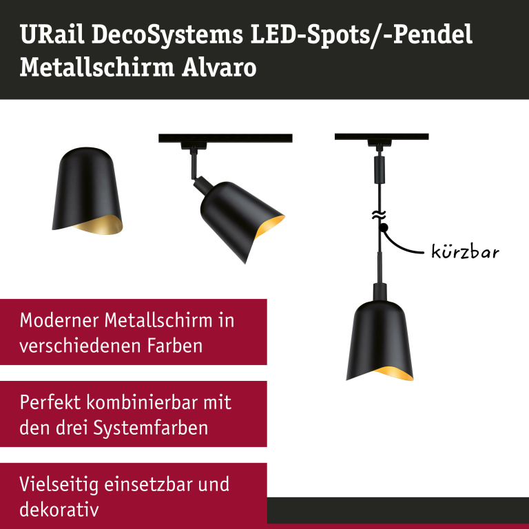 Der Metallschirm Alvaro in Schwarz matt,Gold matt ist eine Ergänzung für die URail DecoSystems LED-Spots oder DecoSystems LED-Pendel. Er ist nicht durchscheinend und ermöglicht in der Pendel-Anwendung eine gezielte, aber weitstrahlende Ausleuchtung. Er ist optimal mit dem Sortiment an Paulmann Tropfenlampen bestückbar. Mit der Spot-Anwendung ermöglicht er durch den breitstrahlenden, aber gerichteten Lichtaustritt eine gute Möglichkeit, Licht- und Schattenzonen im Raum zu schaffen, wobei die Licht-Zonen gleichmäßig beleuchtet werden. Der Schirm ist bestens geeignet für eine Mehrfach-Hängung über Esstischen oder Tresen sowie als Einzel-Hängung über Beistelltischen, Sideboards oder Nachttischen.