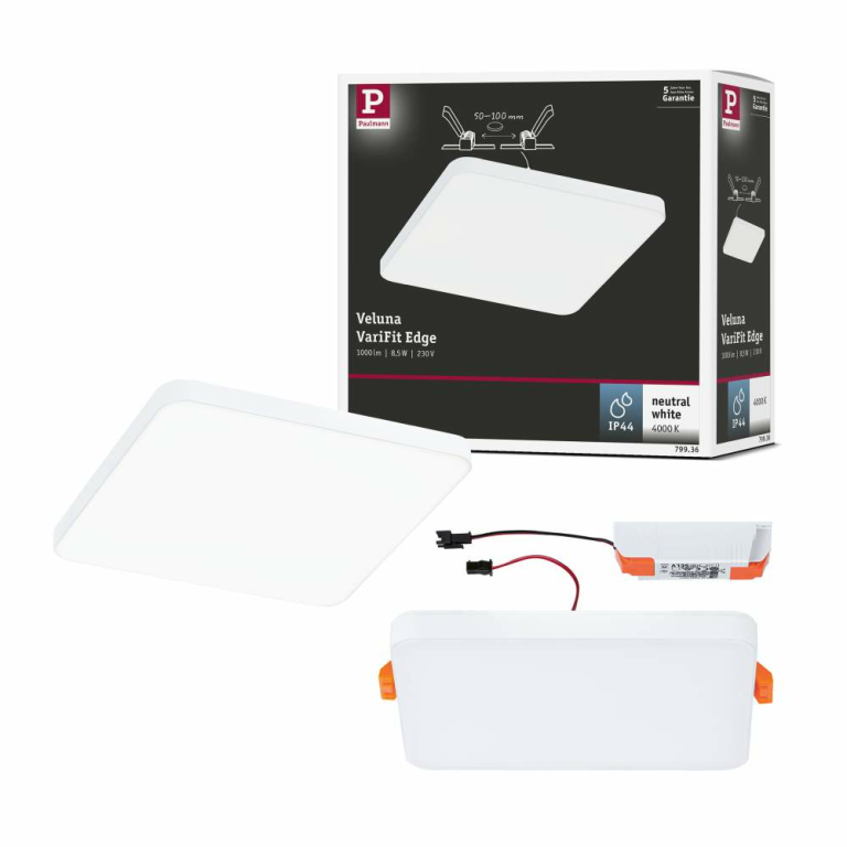 Das eckige Einbaupanel Veluna VariFit Edge überzeugt mit einem modernen, rahmenlosen Design im dezenten Weiß. Mit einer Größe von 120x120 mm und einer Farbtemperatur von 4000K sorgt das Panel für eine hohe, gleichmäßige Lichtausbeute. Dank flexibler VariFit-Technik lassen sich die Klemmfedern für den Einbau stufenlos zwischen 50 und 100 mm einstellen. Damit kann das Panel sowohl in bereits vorhandene als auch in neue Bohrlöcher eingebaut werden. Bei einem Bohrlochdurchmesser von 50 mm wird eine Hohlraumtiefe von 45 mm benötigt. Die satinierte Kunststoffabdeckung schafft eine feine Lichtstreuung und strahlendes, aktivierendes Licht im Neutralweiß.