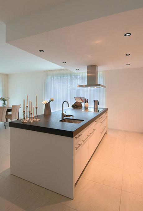 Moderne Kücheninsel mit mehreren Deckeneinbaustrahlern in gleichmäßigen Abständen