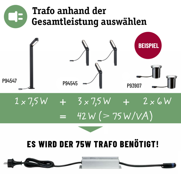 Für das Plug & Shine System sind 3 Trafos erhältlich: 21W, 75W und 150W. Zähle die Wattangaben der einzelnen Leuchten zusammen und plane etwas Reserve für eine eventuelle Erweiterung mit ein, dann weißt du, welchen Trafo du benötigst. Die angegebene Wattleistung der Transformatoren darf nicht überschritten werden.