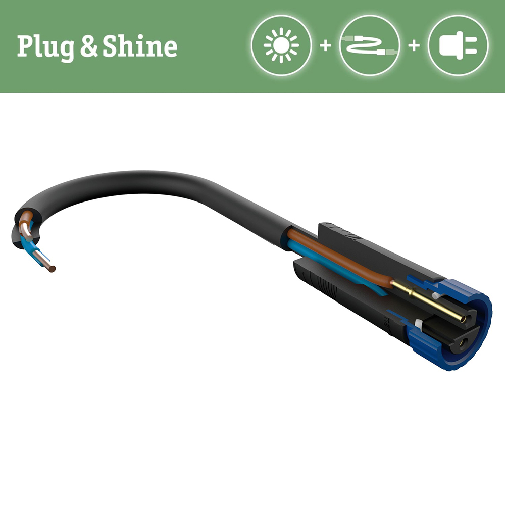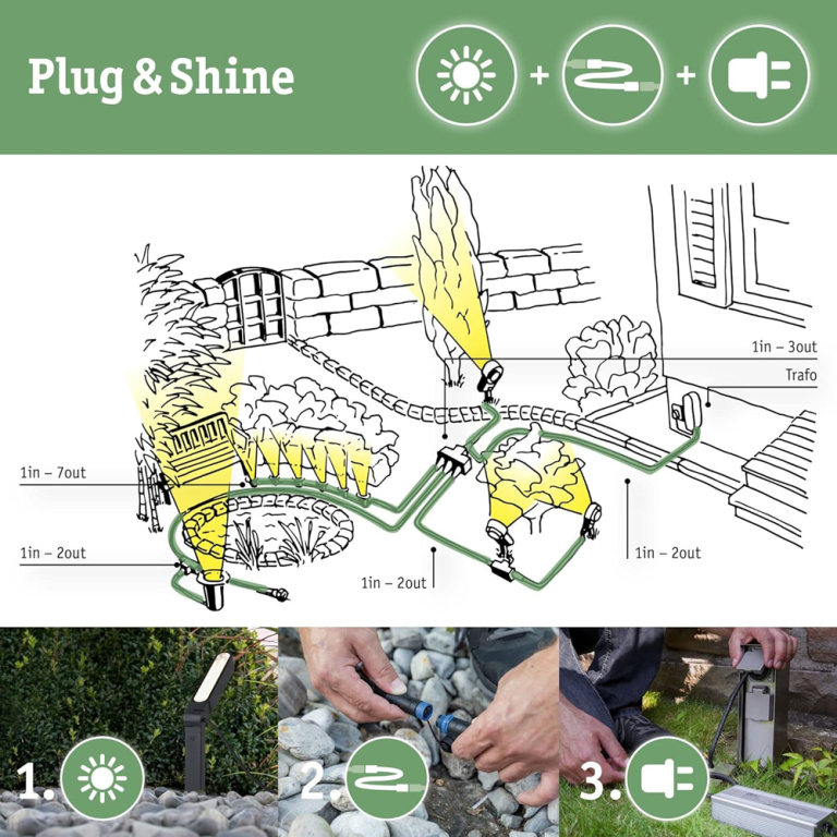 Das Plug & Shine Verbindungskabel überbrückt Entfernungen bis fünf Meter und ermöglicht den Anschluss von vier Leuchten oder weiterem Zubehör. Nicht benötigte Abgänge können mit den mitgelieferten Abdeckkappen verschlossen werden, um den IP68-Tauchwasserschutz zu gewährleisten. In Kombination mit Leuchten und Trafos aus der Paulmann Plug & Shine Serie können Außenbereiche ganz nach eigenen Wünschen beleuchtet werden: von der Hauswand über die Terrasse bis hin zu Gartenwegen und Pflanzen. Montage-Tipp: Die Kabel zur Stromversorgung lassen sich auch über der Erde verlegen, z.B. im Beet oder unter Pflanzen. Damit sparst du dir aufwändige Erdarbeiten. Natürlich kann man das Kabel auch unter der Erde vergraben, da es sich um ein Niedervoltsystem handelt, gibt es aber keine Mindesttiefe, die bei der Installation berücksichtigt werden muss.