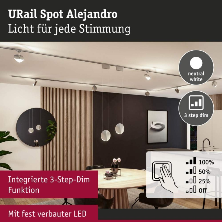 Paulmann 94965 URail LED Schienenspot Alejandro 10W 800lm 4000K 3-Step-Dim dimmbar Chrom matt (LED fest verbaut)